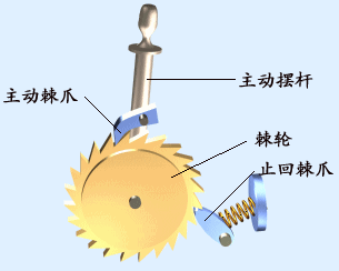 我們先來通過圖片了解主動棘爪、棘輪、主動擺桿、止回棘爪在四個部分,當(dāng)順時針擺動的時候,棘爪便會插入棘輪的齒槽中,棘輪跟隨轉(zhuǎn)動,止回棘爪從齒背上滑動;當(dāng)逆時針轉(zhuǎn)動時,止回棘爪便會死死的卡住齒槽,禁止其逆行。